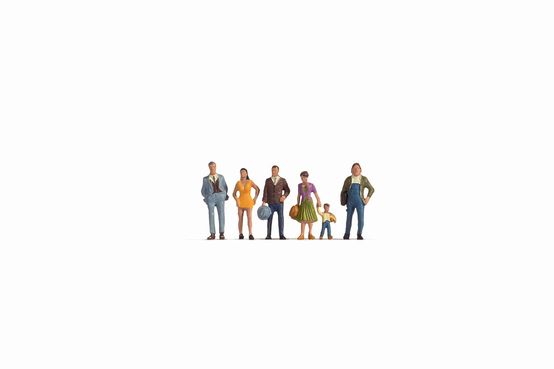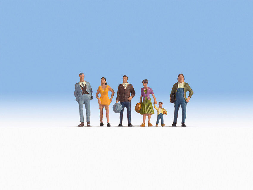 Ein Mann im grauen Anzug und ein Mädchen im gelben Minikleid stehen wartend. Ein Mann in grauer Hose und brauner Jacke trägt eine große Tasche. Eine junge Mutter im grünen Faltenrock hält ihren kleinen Sohn an der Hand. Ein Arbeiter in blauer Arbeitshose und braun-grüner Jacke steht wartend. Das Figurenset ist ideal geeignet um Stadt- oder Dorfszenen auf Modelleinbahnanlagen zu dekorieren. Die Modellfiguren sind insbesondere für die Gestaltung von Bahnsteigen und Bushaltestellen geeignet.