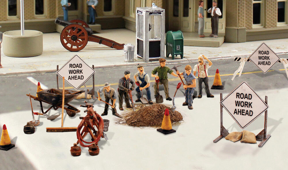 Road crews work constantly installing sewer lines, building roads and filling potholes. Set a road maintenance scene with this figure set that includes five workers and their foreman. Well...four workers, their foreman and one idle man, standing with his hands in his pockets!