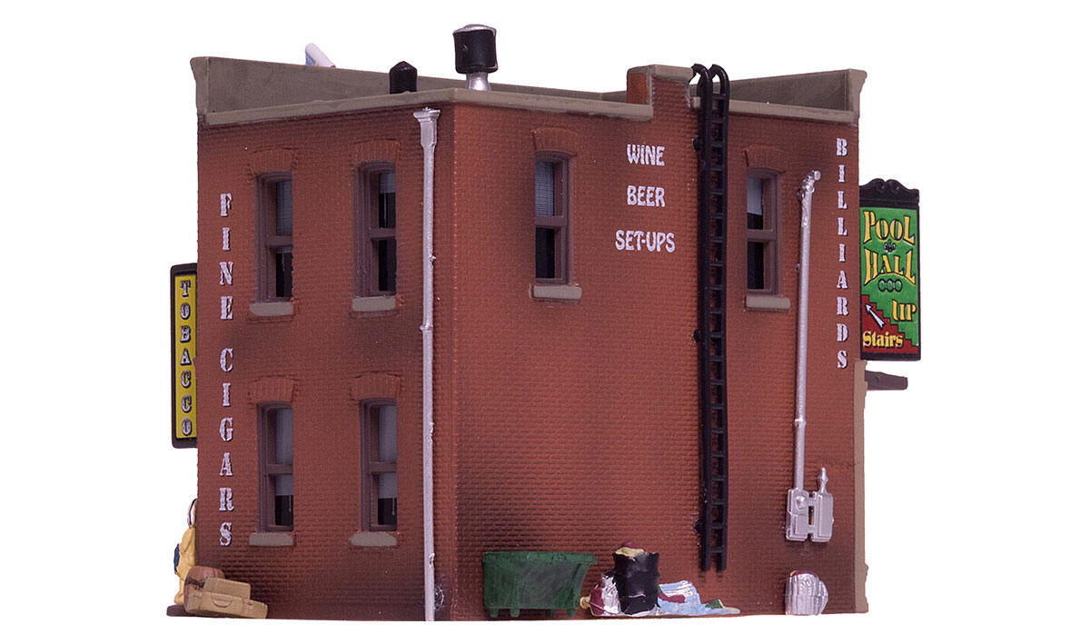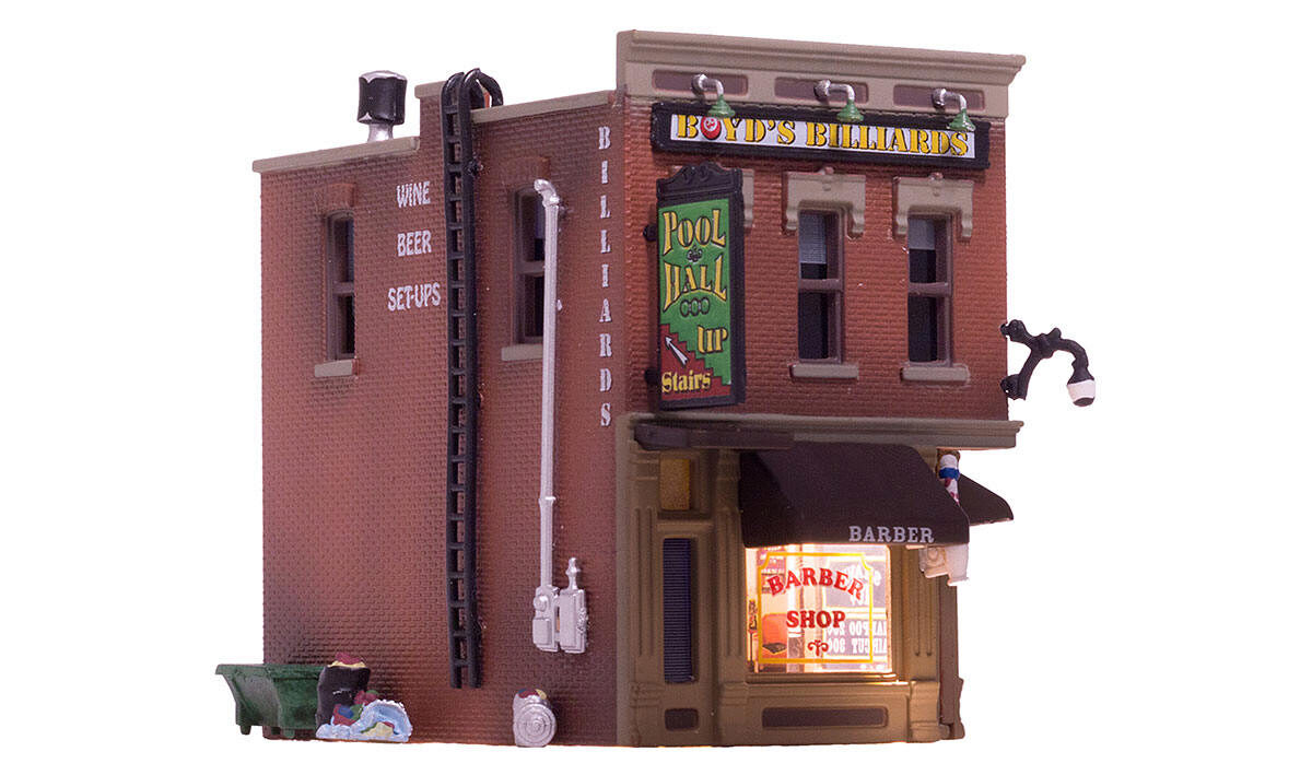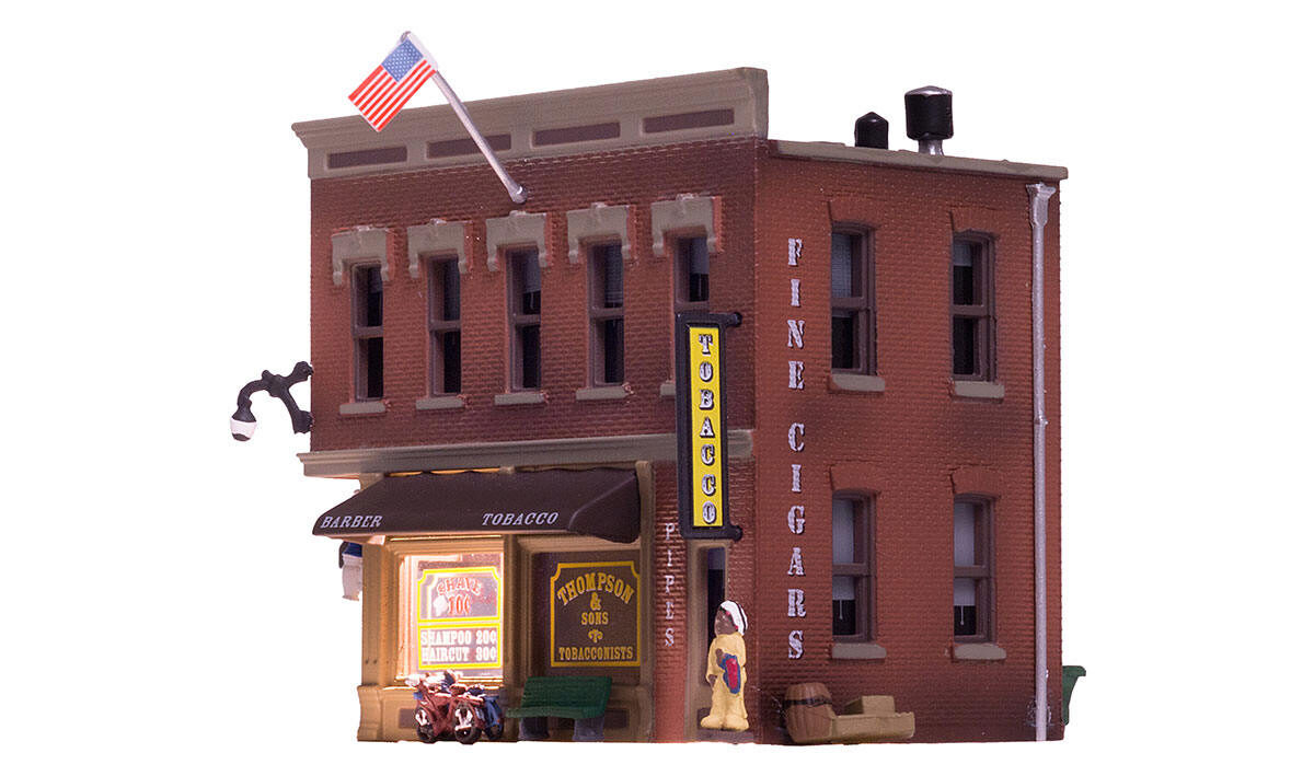 The Corner Emporium is an old-time three-in-one store. There is a barber shop in the front with a tobacco shop in the rear, with billiards upstairs. There are three cycles and an old Cigar Store Native American statue outside the door. This building has signs, posters, a flag, awnings and an old barber pole. The Corner Emporium has one LED light to show off the printed interior. See photos for footprint.