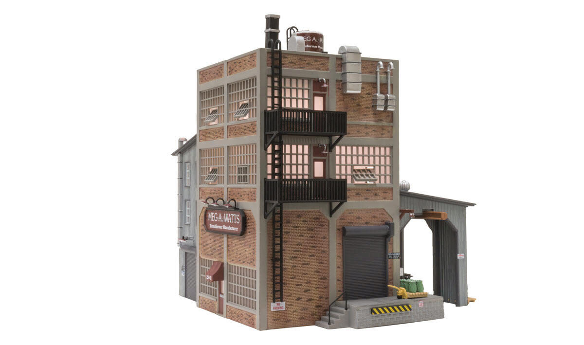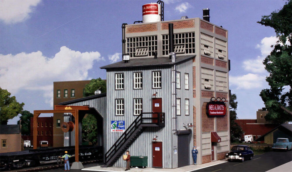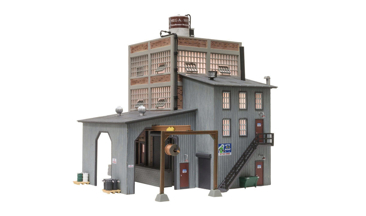 Set as the centerpiece of your layout's industrial park or alongside a spur. Authentic design and details include a track side loading dock, a printed interior, a naturally weathered exterior, full roof detail, rooftop water tower, crated transformers, movable overhead wire spooling assembly, vintage signage and more! See photos for footprint.