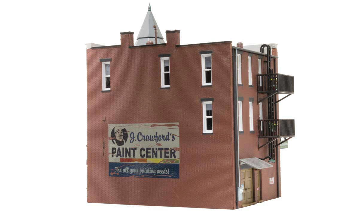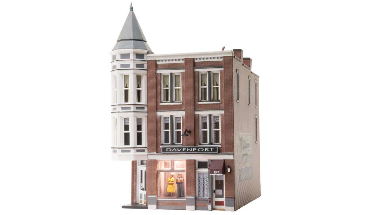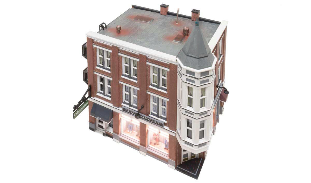 The classic Victorian architecture of Davenport Department Store, with its two-story corner turret, will dress up any downtown scene. Large first-floor picture windows feature mannequins, and second and third-floor windows feature a variety of window treatments. Other details include full roof detail, wrought-iron balconies, a fire escape, signage, awnings, and light fixtures. See photos for footprint.
