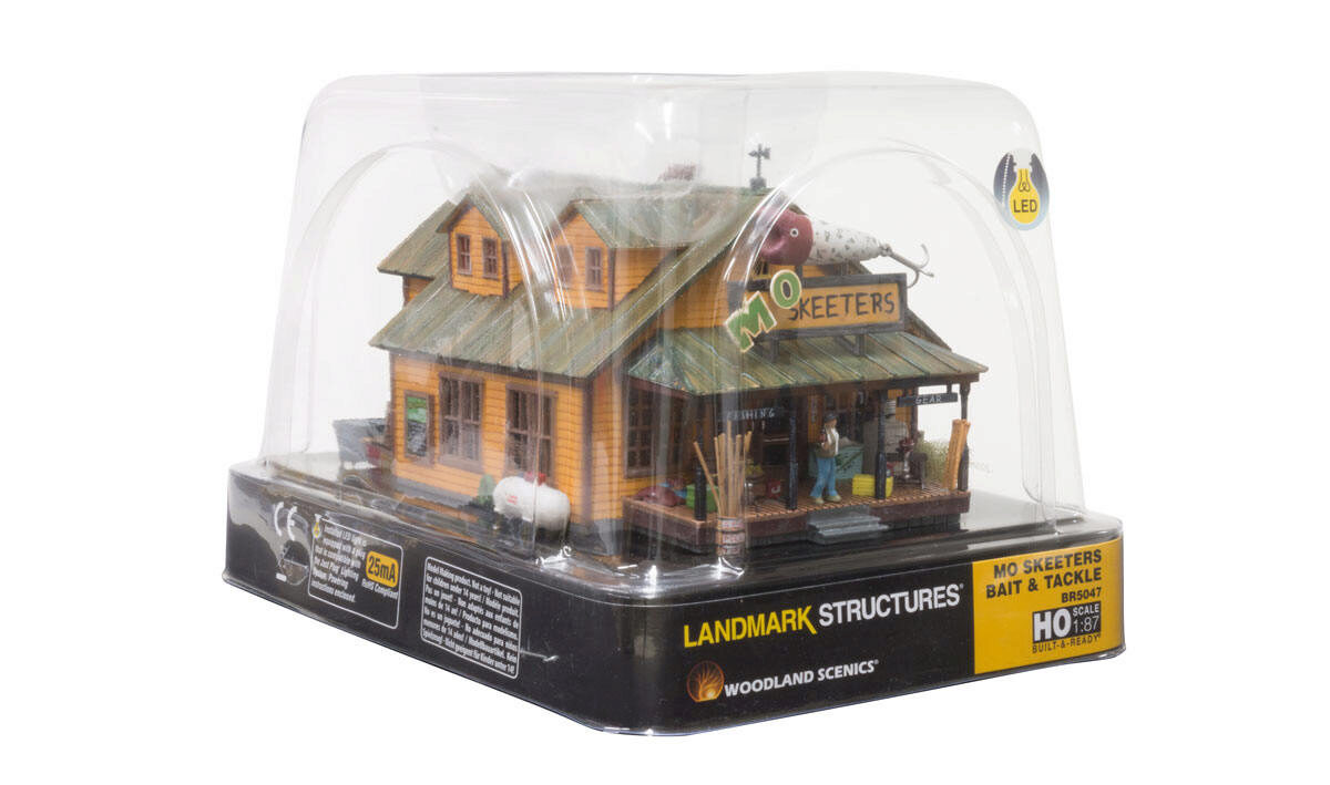Make sure the fishermen can get their bait with Mo Skeeters Bait & Tackle. This rustic bait and tackle shop features a weathered metal roof and narrow clapboard siding. Details include signage, live bait tank, fish nets, barrel of cane poles, fisherman figure, a porch full of stuff, and more! See photos for footprint.