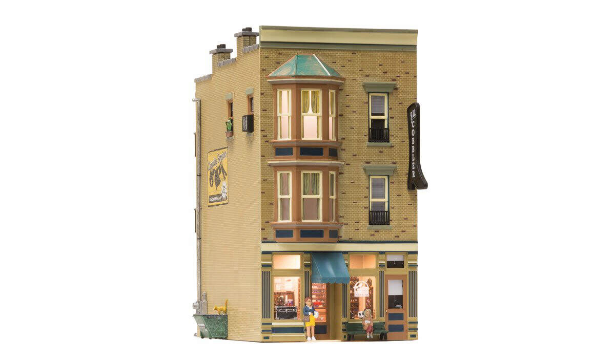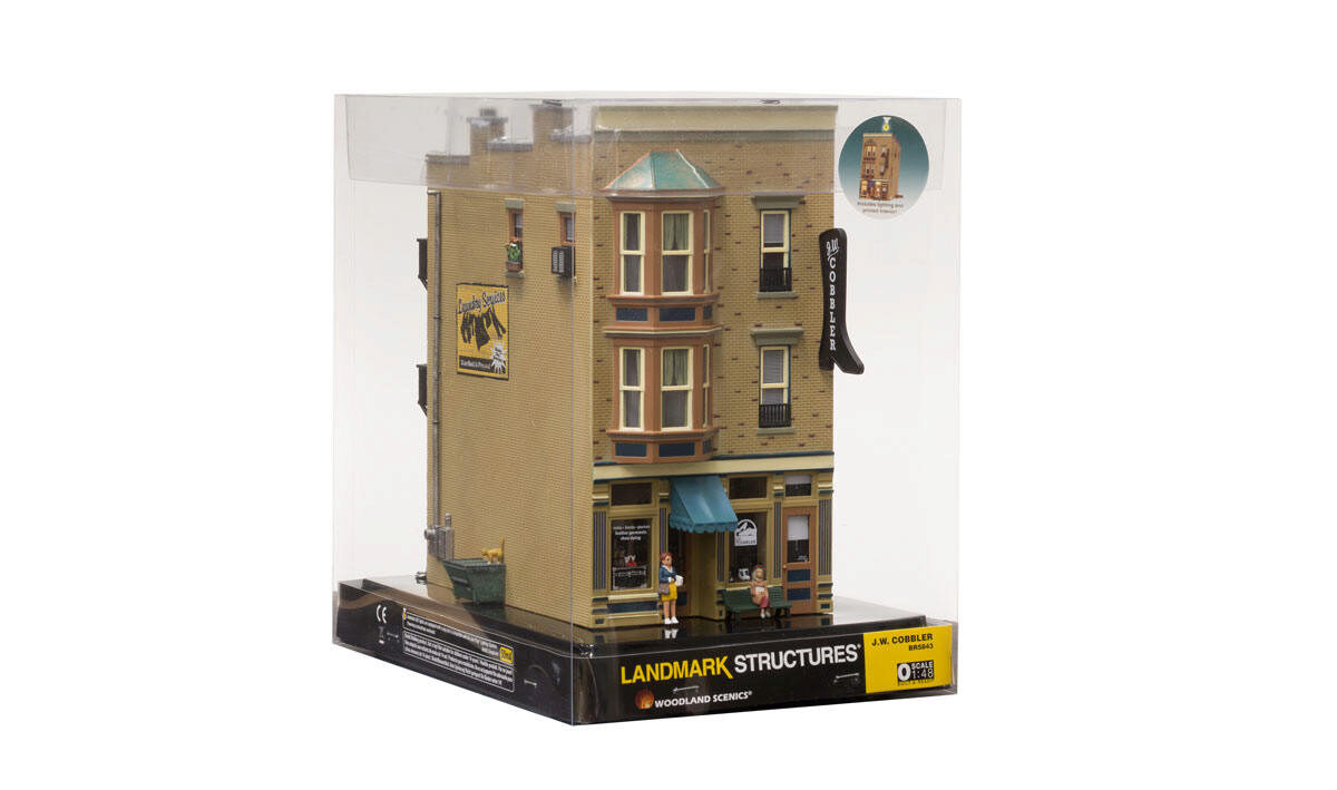J.W. Cobbler models a downtown three-story storefront that houses the local shoemaker shop. A doorbell jingles and the rugged smell of leather greets your nose as you walk through the shop door. You can just imagine the village shoemaker sitting hunched over his cluttered workbench topstitching some new boots or re-soling a pair of shoes. See photos for footprint.