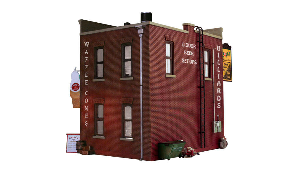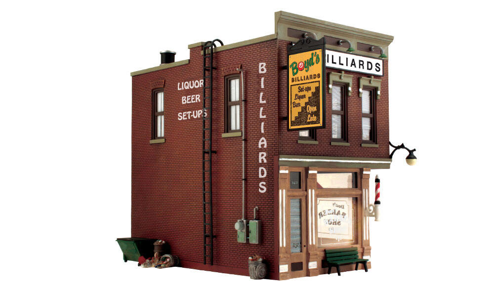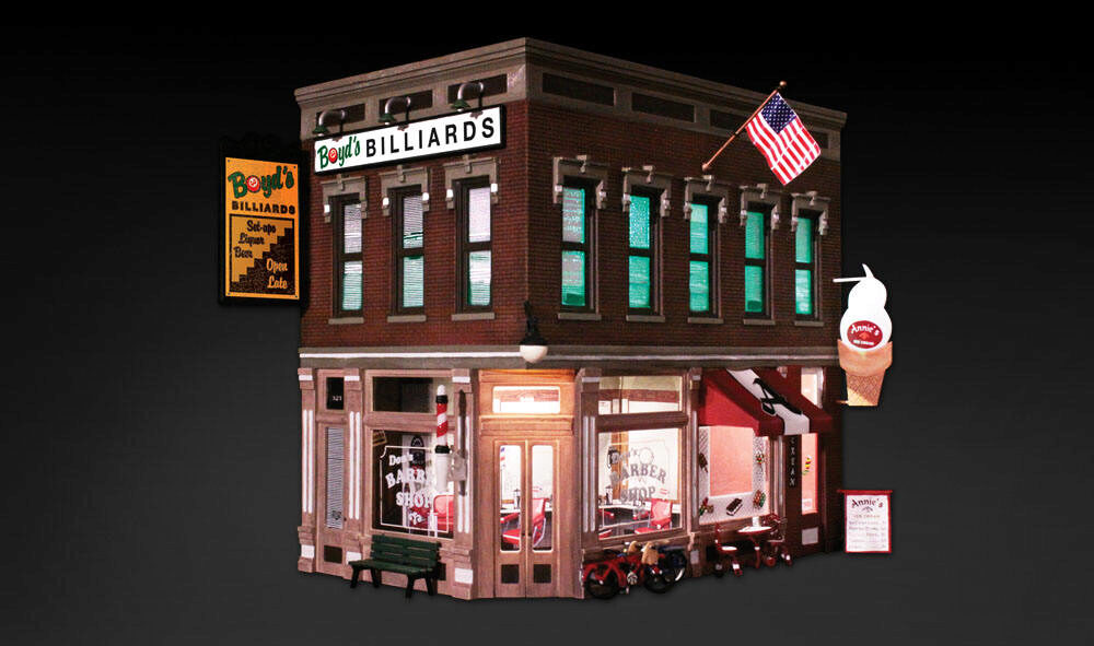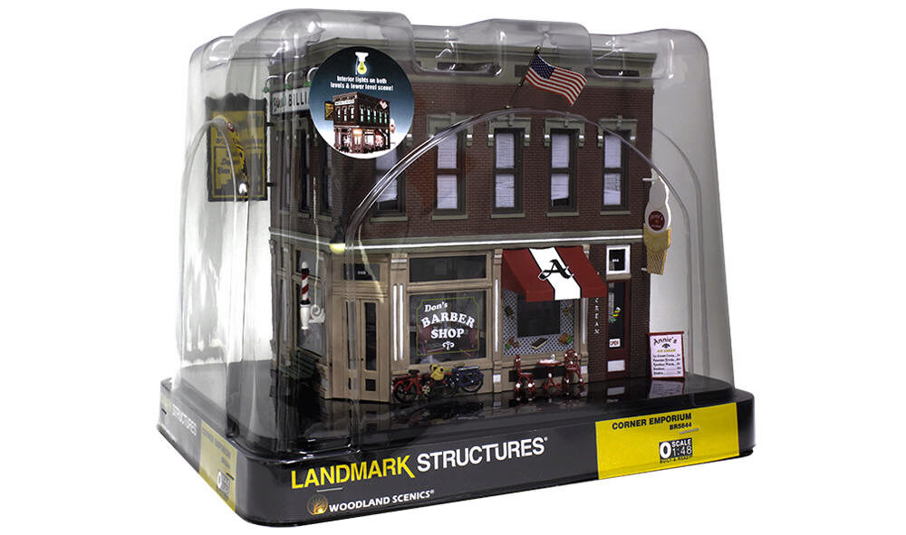 The Corner Emporium is an old-time three-in-one corner store. There's a barber shop, pool hall, and an ice cream and coffee shop. There are loads of details to help set your scene. Details include bicycles signage, barber shop pole, flag, awnings, posters, decals, a parlor table with two chairs, and many more! This building also includes interior lights on both floors and an interior printed scene. See photos for footprint.