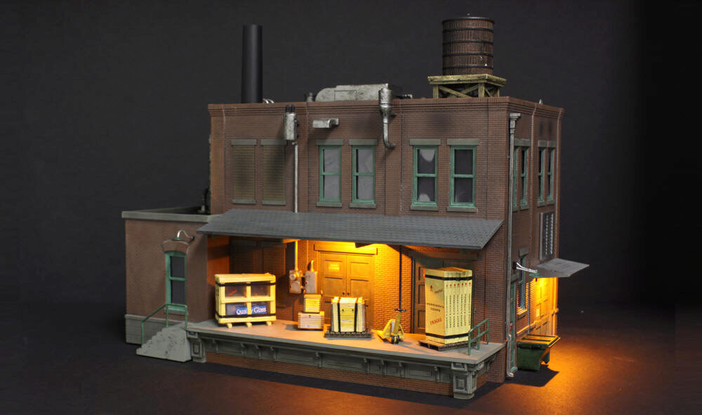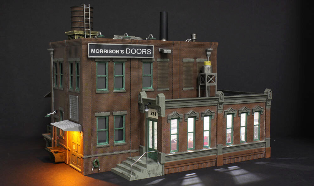 This old factory is great for a layout's industrial park or track spur. Morrison Door Factory has an expertly weathered exterior and roof with full roof detail. The roof has a water tower, smoke stack, transformer, cyclone, piping, and more. Other building details include a propane tank, dumpster, signage, and a dock full of shipping crates and dollies. Morrison Door Factory has a printed office interior, window treatments, and two interior LEDs. There are also exterior LEDs above the dock and above the side door in the awning. See photos for footprint.