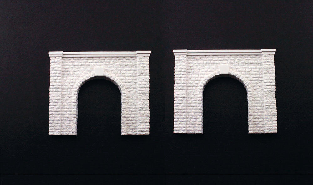 Models sturdy rock tunnel portals for any N scale layout. Easy to color plaster castings. Meets NMRA specifications. Color with Earth Colors™ Liquid Pigment. Set contains 2 pieces.