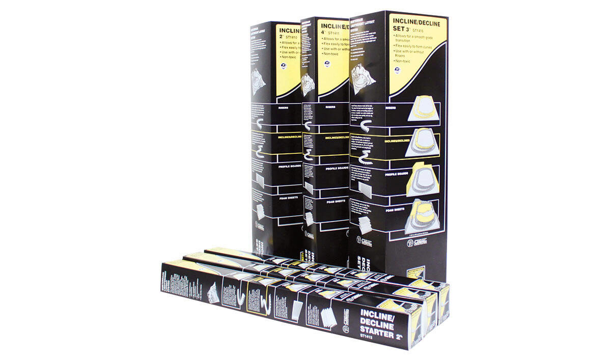 Incline Starters sind Keile aus hochdichtem Schaumstoff, die zum Starten Ihrer Bahn auf einer Steigung oder einem Gefälle verwendet werden. Jedes Stück in einem Paket hebt/senkt die Bahn auf/von einer bestimmten Anzahl Zoll innerhalb einer 24-Zoll-Strecke und ermöglicht so einen sanften Übergang von einer Höhe zur anderen.