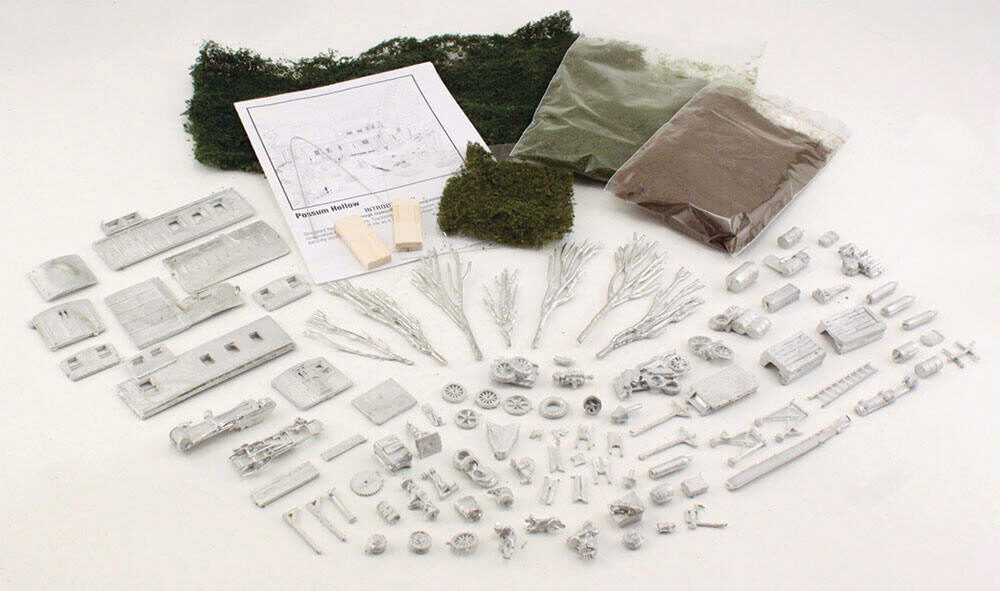 An abandoned caboose has been converted to a home for a backwoods family. The piles of accumulated junk add to the rustic atmosphere. The Possum Hollow scene is approximately 9" x 8" (22.8 cm x 20.3 cm).