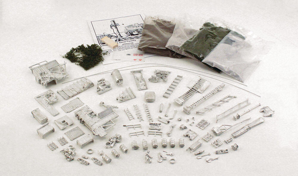 This is a common sight found around railroad yards. The sand tower supplies the locomotives' needs while the storage shed keeps the caboose well stocked. The Caboose & Sand Facility scene is approximately 9" x 8" (22.8 cm x 20.3 cm).