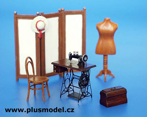Dioramenset bestehend aus 29 Resinteilen und Fotoätzsatz. Schneiderpuppe, Nähmaschine, Stuhl, Paravent und Hut.