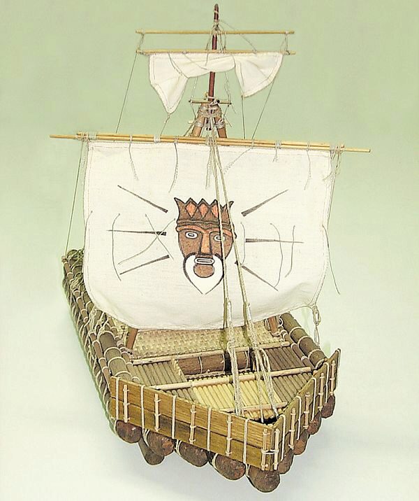 Genaue Reproduktion, des bekannten Floßes Kon-Tiki, welches als Kopie eines prähistorischen Bootes aus Südamerika konstruiert wurde. Es wurde aus 9 Balsaholzstämmen aus Ecuador hergestellt, wobei diese nur zusammengebunden waren. Es trug eine Besatzung von 6 Mann, die von Callao in Peru am 28. April 1947 in See stachen und nach 101Tagen Seefahrt die Insel Raroia in Polynesien nach einer Reise von 4300 Seemeilen erreichten.