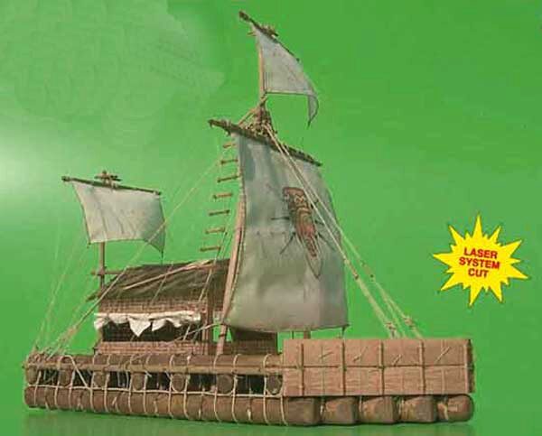 Der Baukasten der Kon-Tiki enthält die Bohlen für das Floß, die geflochtenen Aufbauten mit Laserstrahl gefertigt und sämtliches Zubehör zum Bau des kompletten Modells. Eine ausführliche Bildanleitung erleichtert den Zusammenbau.