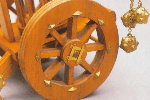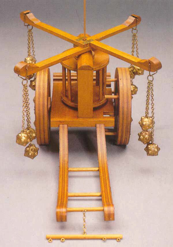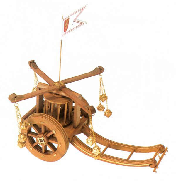 Dieser Kampfwagen wurde von Leonardo da Vinci konstruiert und stellt gewissermaßen ein Zwischenglied zwischen Hannibals Elefanten und modernen Tanks dar. Er wurde von zwei Pferden gezogen und die rotierenden Metallkugeln sollten eine Bresche in die feindlichen Linien schlagen.