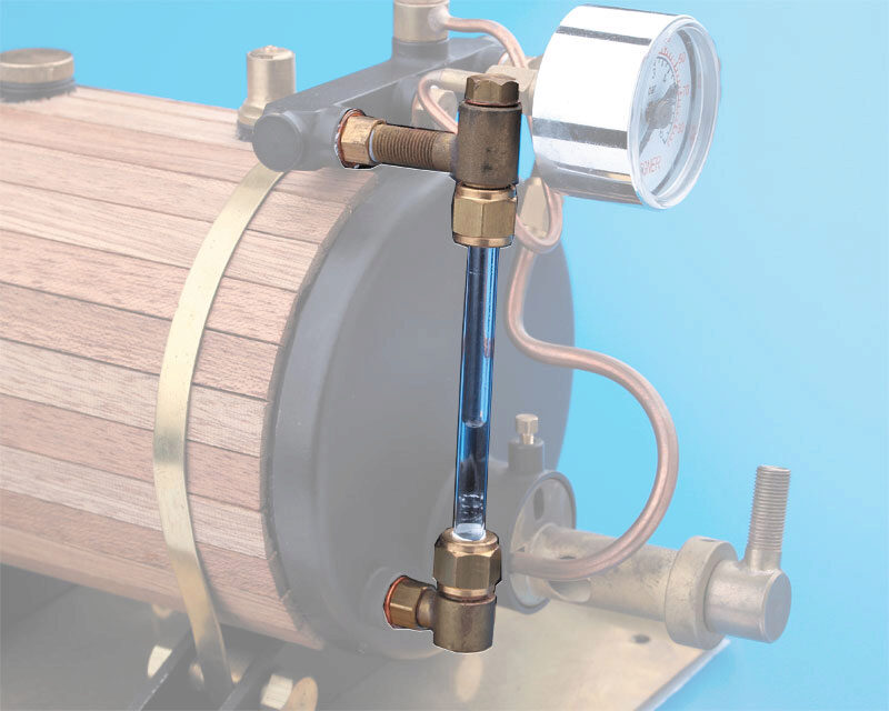 Wasserstandsanzeige für stehenden Kessel der Dampfmaschine Victor. Komplett mit Glasröhrchen und allen Metallbeschlägen. Kann durch Kürzen des Glasröhrchens auch für andere Kessel verwendet werden.