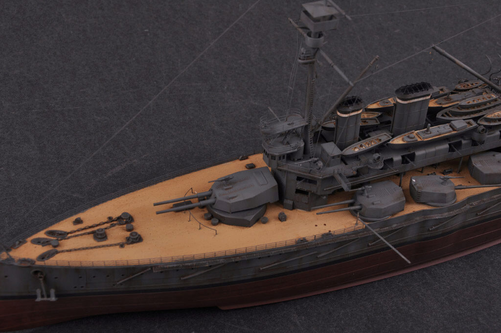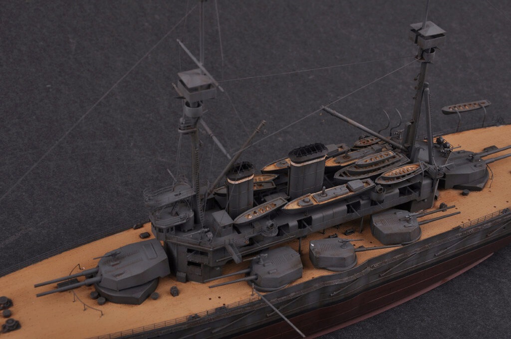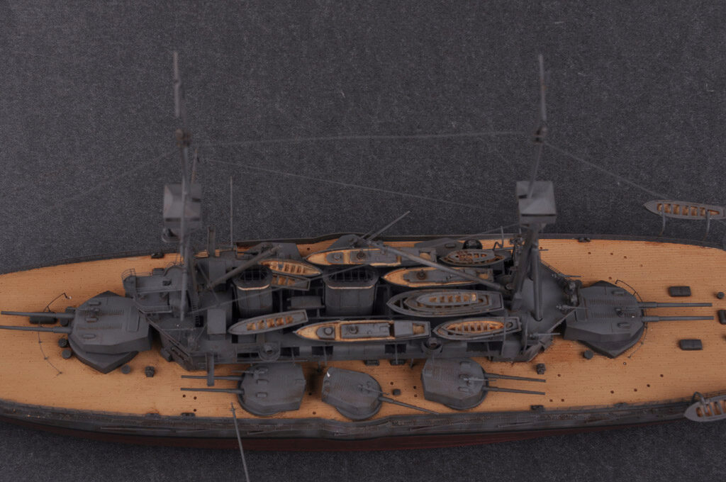 Plastikmodellbausatz eines britischen Schlachtschiffes aus den 1900er Jahren mit 460 Teilen, Metall- und Photoätzteilen. Länge gebaut 386,2 mm / Durchmesser 69,2 mm.