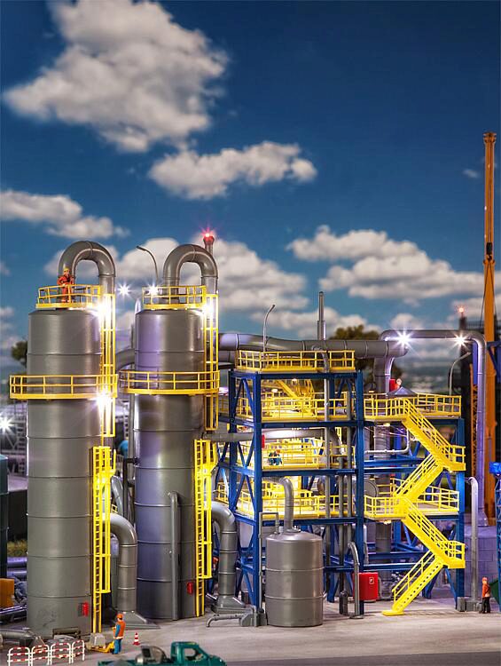 Megaplant im Mini-Maßstab. Produktionsanlage der chemischen Industrie, mit großem Tank und Reaktor, in dem der Einsatzstoff zu einem Produktgemisch reagiert, das anschließend durch unterschiedliche Siedepunkte in einer Kolonne getrennt wird. Verdampfte Flüssigkeiten und Gase werden über Wärmeaustauscher kondensiert und über Rohrleitungen zur Lagerung in Tanktassen geleitet, die als Auffangvolumen dienen. Die Lagerung und Bedienung von weiteren notwendigen Maschinen, Pumpen, Luftkühlern oder Kompressoren erfolgt in dem freistehenden, mehrgeschossigen Apparategerüst, das über Treppen und Steigleitern erschlossen wird. Der Bausatz ist modular erweiterbar, z.B. mit der »Kolonne mit Rohrleitungen«, Art. 130177.