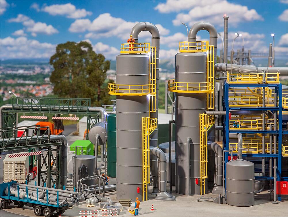 Für das Trennen von Stoffgemischen im Bereich der thermischen Verfahrenstechnik. 1 Exemplar einer Industrie-Kolonne in ihrer typischen Säulenform mit zwei Plattformen, Leitern, Lampe und Rohrleitungen, über welche die in Kopf- und Sumpfprodukt zerlegten Gemische abgezogen werden. Für die Darstellung der Isolierung von drei oder mehr Stoffkomponenten ist das Modell modular erweiterbar und kombinierbar, z.B. mit Art. 180330, Industrie-Hochtank.