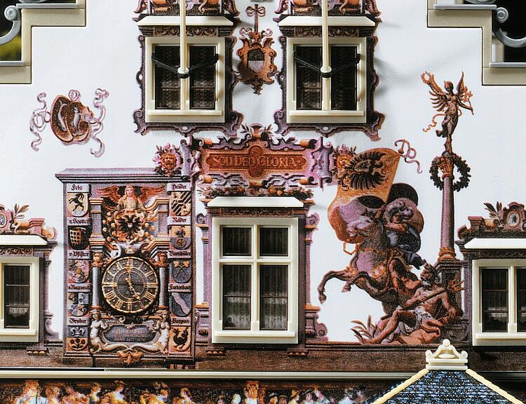 Verbesserte Wiederauflage! Modell des 1436 erbauten »Alten Rathauses« in Lindau mit hochwertigem Digitaldruck der prächtigen Fassadenmalerei zur Lindauer Stadtgeschichte an Nord- und Südfront des historischen Gebäudes mit gedeckter Freitreppe, Verkünder-Erker und Volutengiebeln.