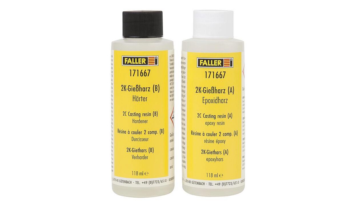 Erstklassiges Ergebnis. Ideal zum Gießen von kleinen Modellen oder Bauteilen. Härtet glasklar aus bei einer Verarbeitungszeit von 45 Minuten. Das Material kann auch in Kombination mit verschiedenen Füllstoffen verarbeitet werden. Mischungsverhältnis 1:1, um beste Ergebnisse zu erzielen. Nachträgliches Kolorieren der Gießlinge ist möglich. Verwenden Sie für perfekte Resultate die »Abformmasse«, Art. 171665 und das »Formtrennmittel«, Art. 171666.