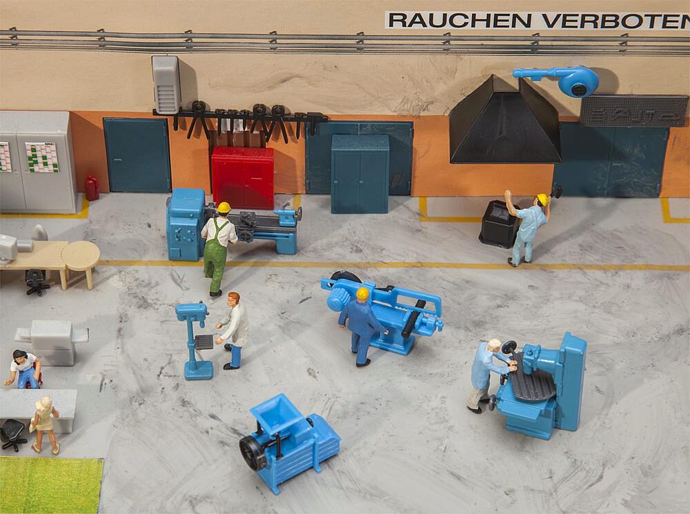 Das Set besteht aus einer Fräsmaschine, einer Ständerbohrmaschine, einer Bügelsäge, einer Drehbank, einer Werkzeugwand und verschiedenen Schmiedewerkzeugen.