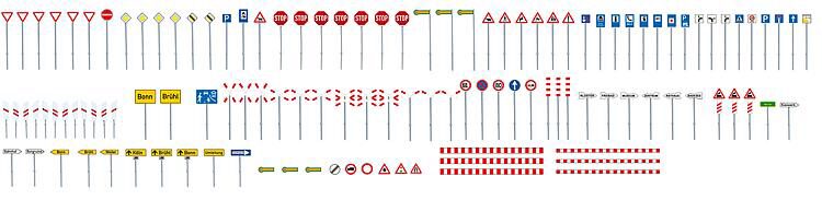 Set mit 120 digital bedruckten Ortsschildern und Verkehrszeichen mit Pfosten sowie Andreaskreuzen.