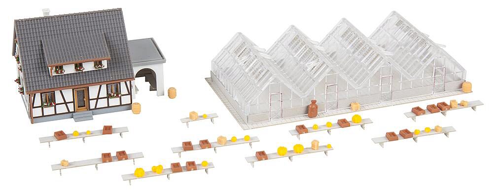 Ganzjährige Pflanzzeit. Schmucker kleiner Gartenbaubetrieb bestehend aus einem Fachwerkwohnhaus mit Garage sowie 4 gläsernen Gewächshäusern, die den Anbau diverser Pflanzen, Obst- und Gemüsesorten sicherstellen. Diverse Zubehörteile zur Ausschmückung liegen bei.
