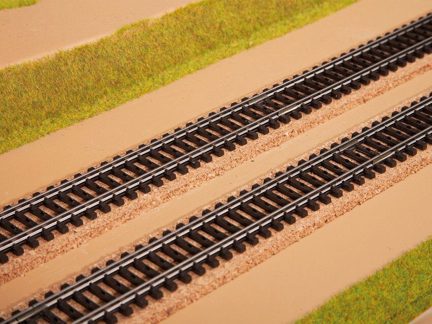 Um ein perfektes Gleisbett zu gestalten, empfehlen wir NOCH Kork-Gleisbettungen als Gleisunterlage (z. B. Spur H0 Art-Nr. 50410, Spur TT Art.-Nr. 50460 bzw. Spur N Art.-Nr. 50490). Diese wirken geräuschdämmend und schaffen bereits die Optik eines aufgeschütteten Schotterbetts mit kleinen Böschungen rechts und links des Gleises. Der Schotter wird lose aufgestreut und anschließend mit einem Pinsel in die Zwischenräume der Schwellen verteilt. Danach träufelt man den NOCH Schotter-Kleber (Art.-Nr. 61134) darüber, um den Schotter dauerhaft zu fixieren.