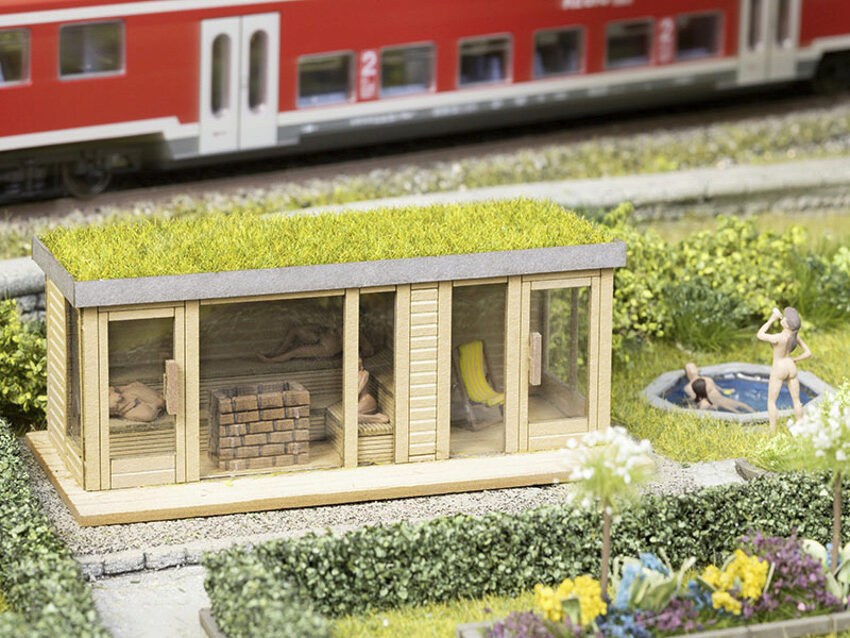 Der Laser-Cut minis Bausatz »Sauna mit Einblick« ist für Modellbahnanlagen mit dem Maßstab 1:87 (Spurweite H0) geeignet. Dieser kleine, aber filigrane Bausatz ist mit Sicherheit ein echter Hingucker auf Ihrer Modellbahnanlage. Wer schaut nicht gerne den nackten Modellfiguren beim Saunagang zu? :-)