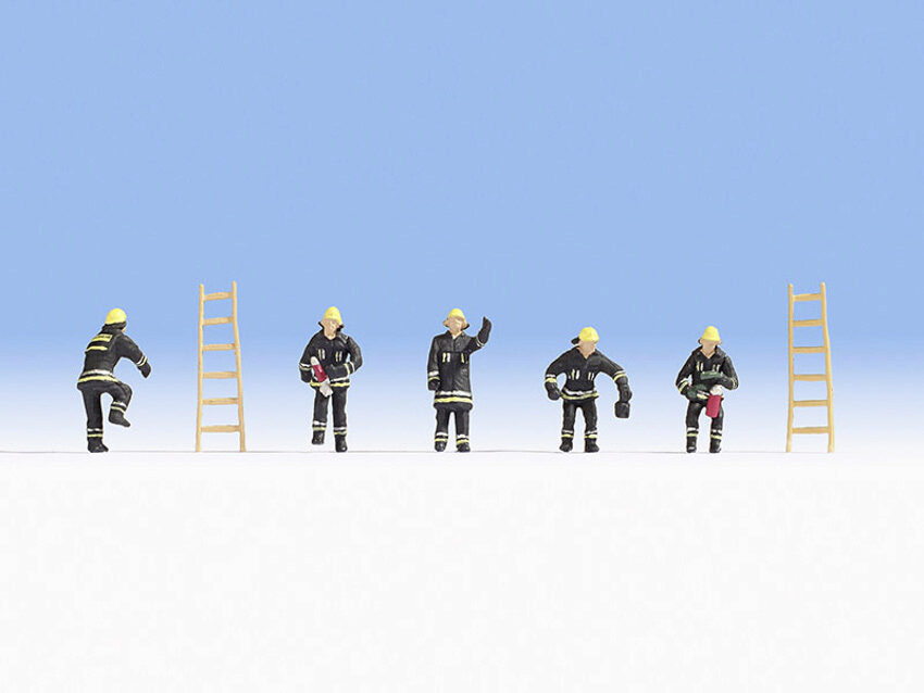 Das Set enthält fünf Feuerwehrmänner im Einsatz und zwei Leitern. Die Feuerwehrleute für die Spur H0 (Maßstab 1:87, ca. 2 cm hoch) sind realistisch handbemalt und tragen schwarze Schutzanzüge. Die Modellfiguren sind ideal für die Ausgestaltung von Einsatzszenen auf Modellbahnanlagen und in Dioramen geeignet.
