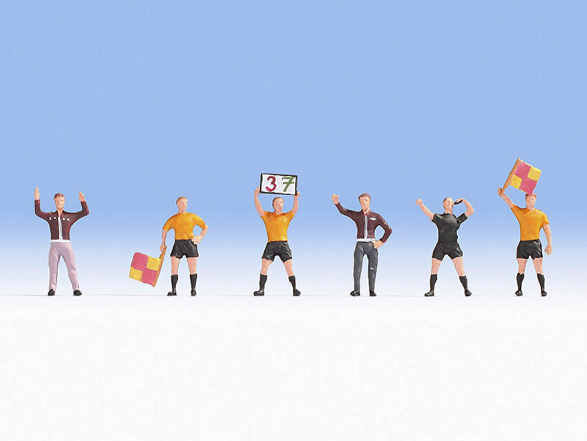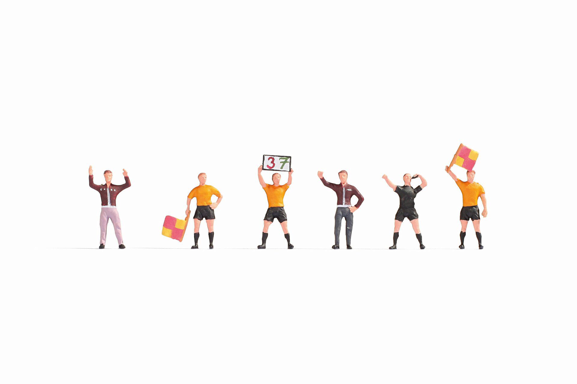 Das Set für die Spur H0 (Maßstab 1:87, ca. 2 cm hoch) enthält einem Schiedsrichter in typisch, schwarzen Kleidung und einer Trillerpfeife, drei Linienrichter, sowieso zwei Trainern.