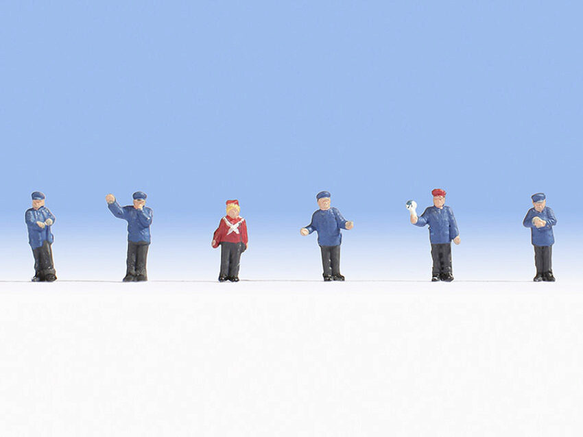 Das Modellfiguren-Set besteht aus sechs handbemalten »Bahnbeamten Deutschland«. Fünf Personen sind männlich und eine weiblich. Die Frau im Bunde ist blond, trägt eine rote Mütze, ein rotes Oberteil, eine schwarze Hose und schwarze Schuhe. Um den Hals hat sie ein weißes Tuch über Kreuz gebunden. Die Männer haben alle die typische Uniform der Bahnbeamten an. Diese besteht aus einer blauen Mütze mit Schild, einer blauen Jacke, einer schwarzen langen Hose und schwarzen Schuhen. Manche haben eine Trillerpfeife in der Hand und andere eine Kelle.