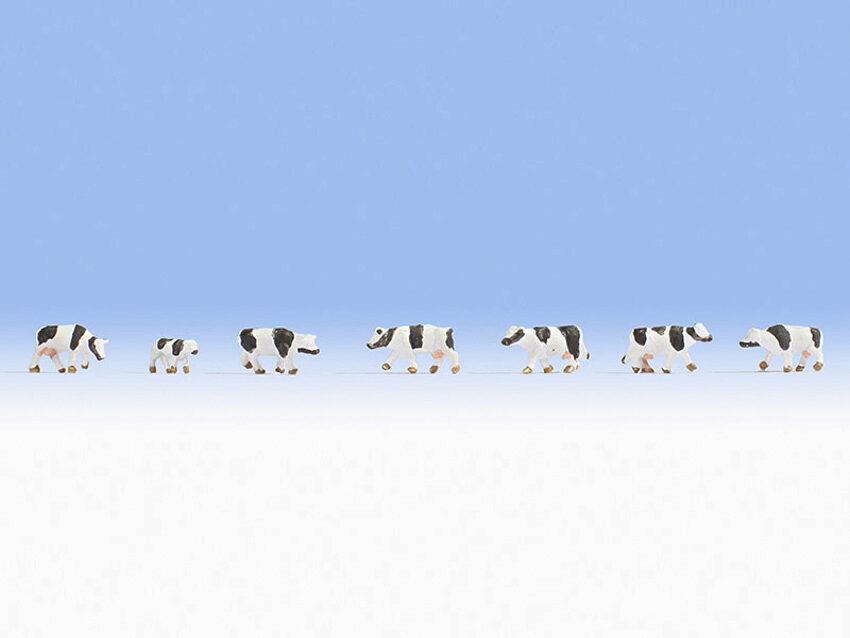 Das Modellfiguren-Set »Kühe schwarz-weiß« enthält sieben Kühe. Alle Modelltiere sind handbemalt und können ganz beliebig auf der Modellbahnanlage und dem Diorama eingesetzt werden. Wer eine landwirtschaftliche Szene gestalten möchte, greift am besten zu den Kühen von NOCH. Sie sind schwarz-weiß und sogar ein kleines Kalb ist im Set enthalten. Damit kann der Bauernhof realistisch und naturgetreu ausgestaltet werden. Wer ein wenig Abwechslung möchte, kann auch die braun-weißen Kühe (Art.-Nr. 44251) oder die braunen Kühen (Art.-Nr. 44252) verwenden. Wie überall beim Hobby Modell-Landschaftsbau kann auch hier der Kreativität freien Lauf gelassen werden