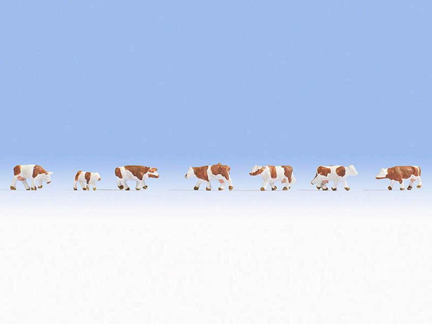 Das Modellfiguren-Set »Kühe braun-weiß« enthält sieben Kühe. Alle Modelltiere sind handbemalt und können ganz beliebig auf der Modellbahnanlage und dem Diorama eingesetzt werden. Wer eine landwirtschaftliche Szene gestalten möchte, greift am besten zu den Kühen von NOCH. Sie sind braun-weiß und sogar ein kleines Kalb ist im Set enthalten. Damit kann der Bauernhof realistisch und naturgetreu ausgestaltet werden. Wer ein wenig Abwechslung möchte, kann auch die schwarz-weißen Kühe (Art.-Nr. 44250) oder die braunen Kühen (Art.-Nr. 44252) verwenden. Wie überall beim Hobby Modell-Landschaftsbau kann auch hier der Kreativität freien Lauf gelassen werden