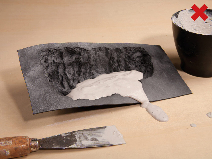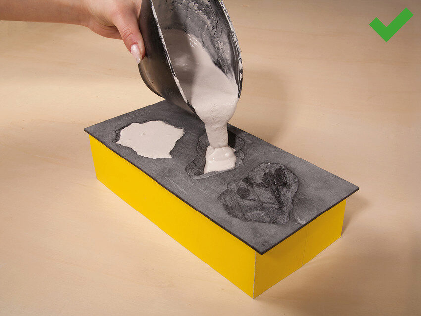 Die Gussformen haben eine spezielle Innenbeschichtung, durch die die Felsen nach dem Aushärten leichter entformt werden können. Die Verpackung der Gussformen ist außerdem so konzipiert, dass sie gleichzeitig als stabiler Gussrahmen dient. Man stellt diesen Rahmen zur Stabilisierung unter die Fels-Gussform. Anschließend kann man sie eben mit PROFI-Gießmasse ausgießen.