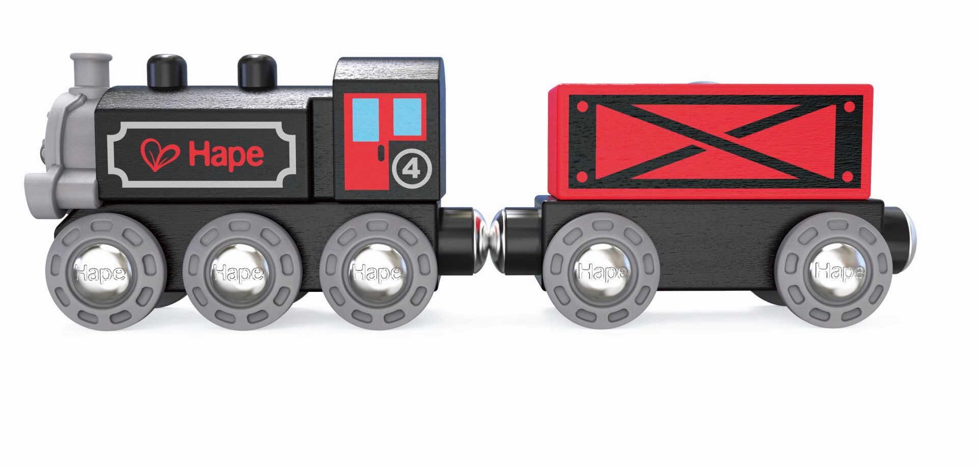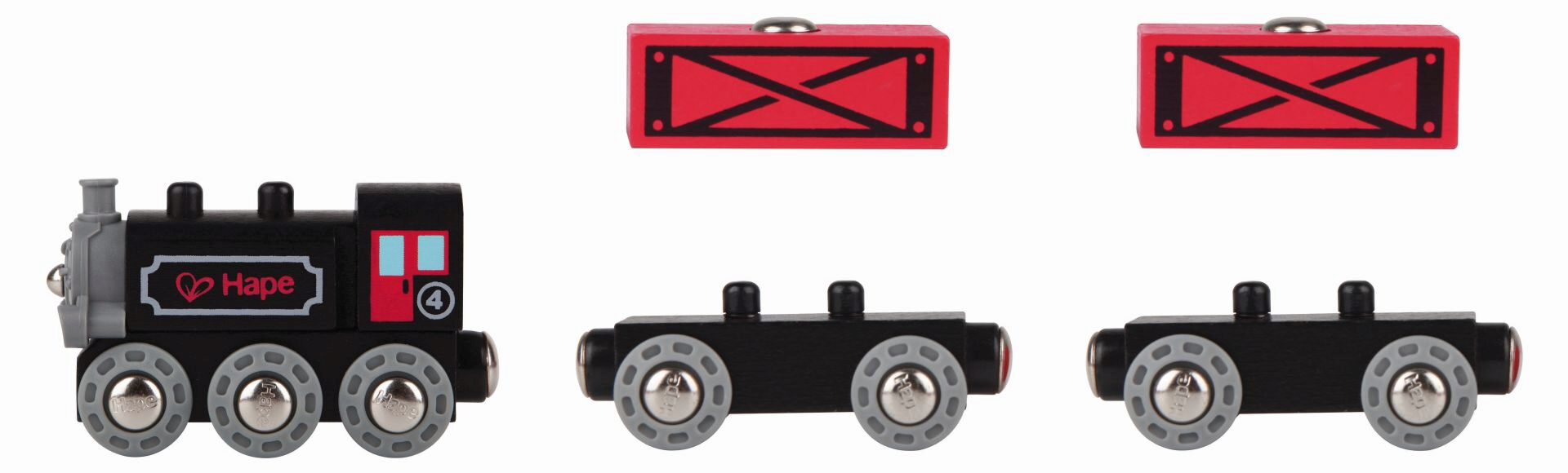 Dampfmacher: Tuckere die Schienen entlang mit diesem klassischen Dampf-Frachtzug! Mit einer schwarzen Lok und zwei leuchtendroten Waggons erledigt dieses hübsche Set alle Aufgaben.