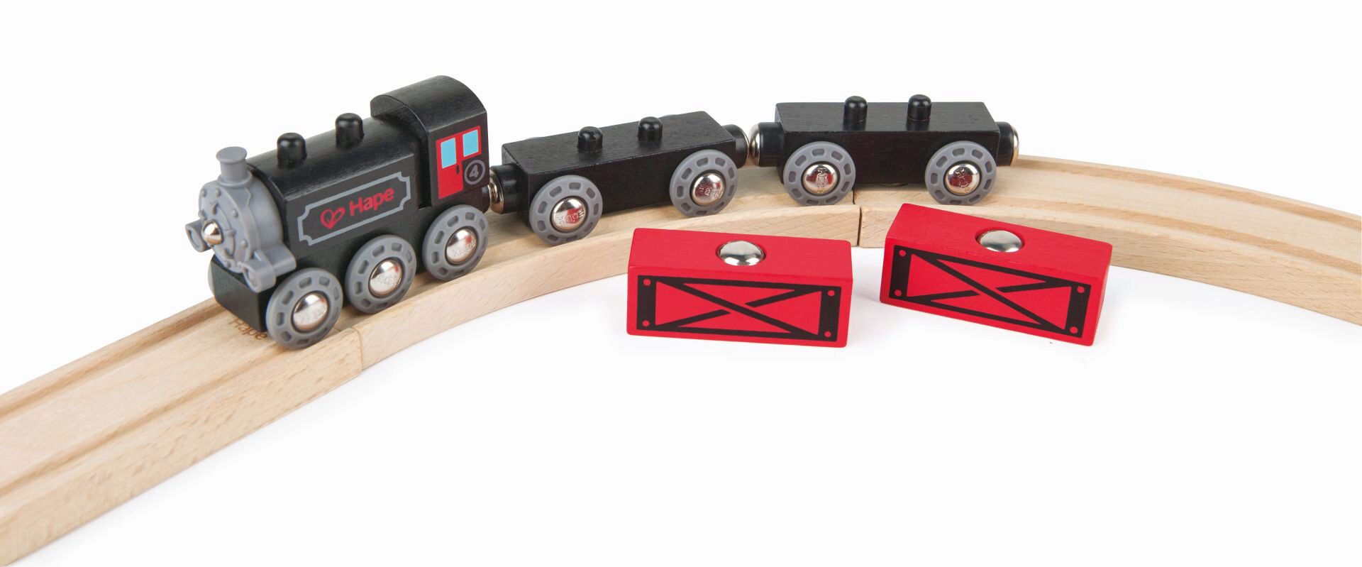 1. Kopple mit den Magneten die Waggons untereinander und an die Lokomotive an. 2. Schiebe den Zug über das Gleis.