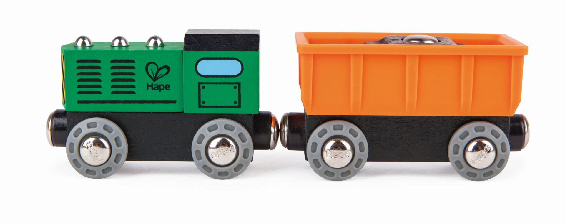 Schiebe den Diesel-Frachtzug die Schienen entlang, um Güter zum Markt zu transportieren! Die Waggons des Zugs sind mit Erzblöcken beladen, die vom grossen, magnetischen Kran angehoben werden können.