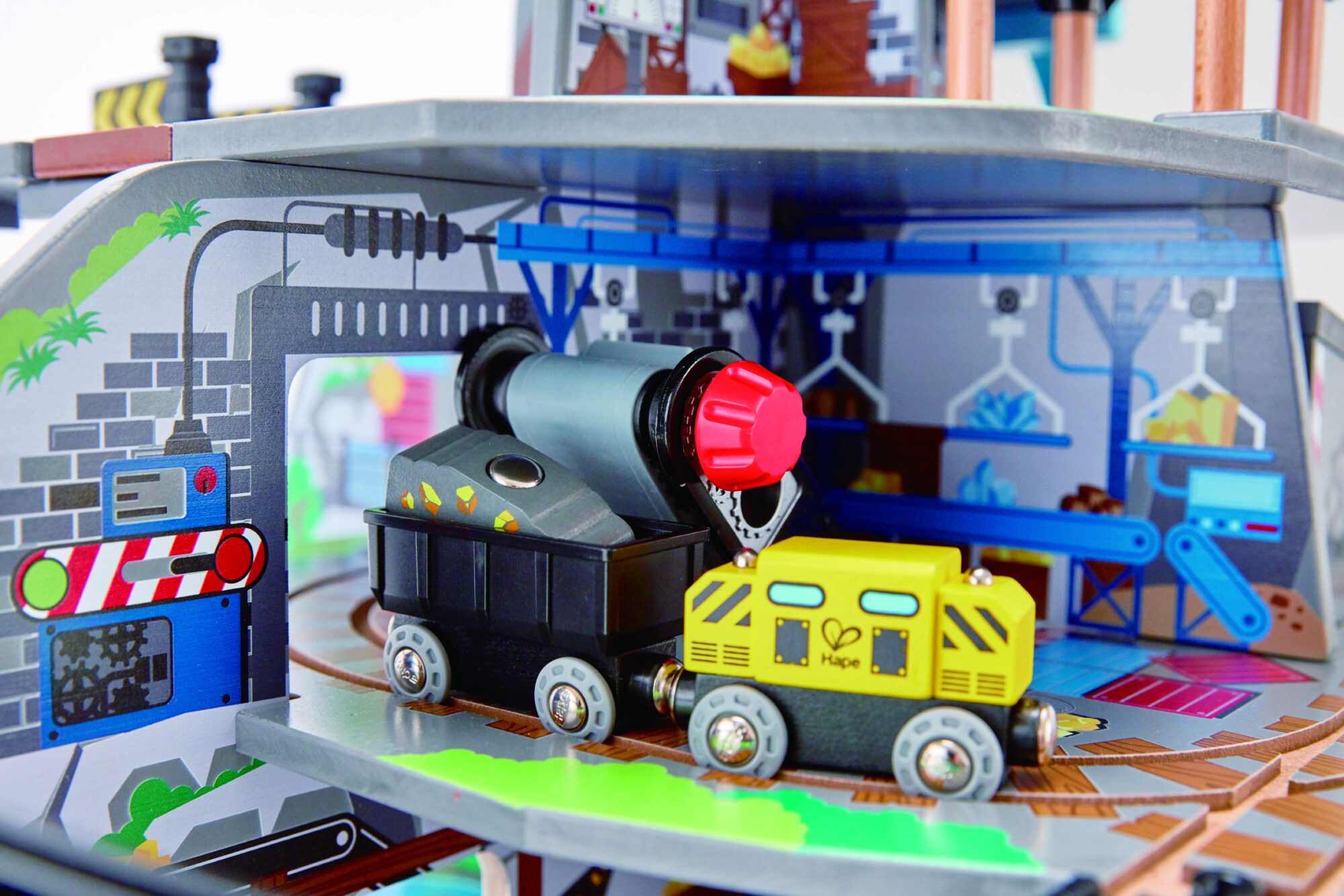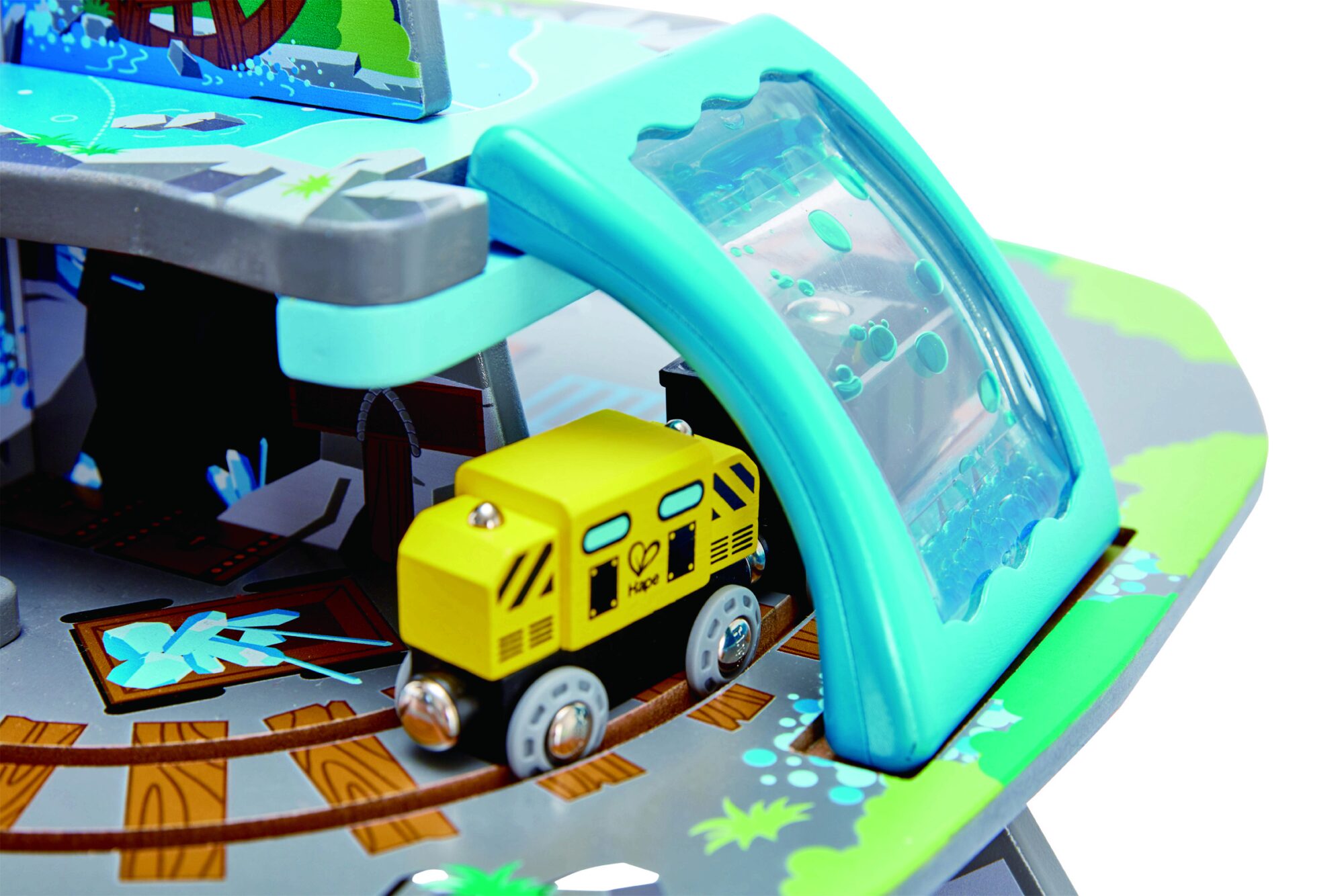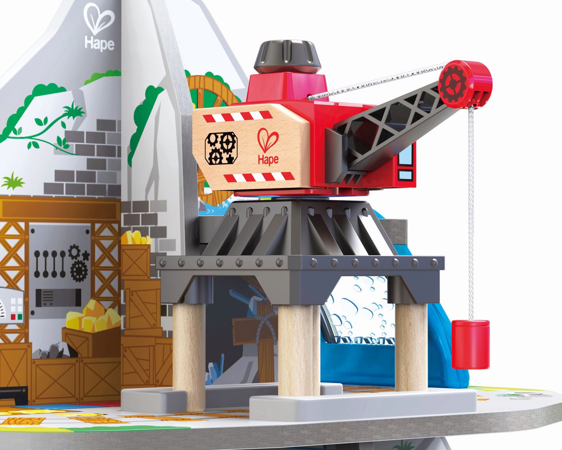 Spielen mit Tiefgang! Fahre deinen Zug von der Spitze des Berges in die betriebsame Mine tief im Inneren! Dieses mehrstöckige Spielset bietet das ultimative Holzschienen-Erlebnis Í mit Wasserfall-Tunnel, Hindernis-Brücke, Kran, Förderband und Werkstatt!