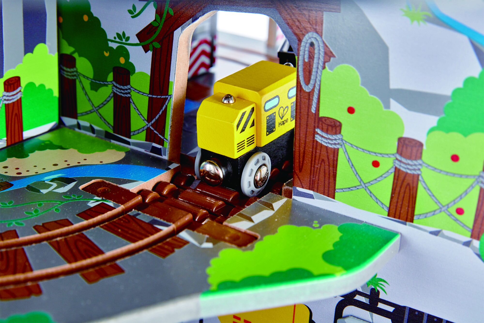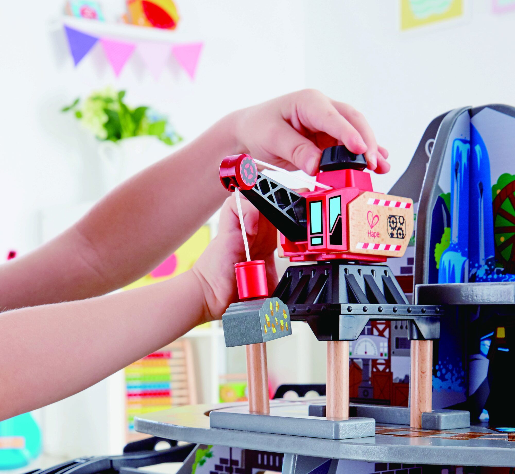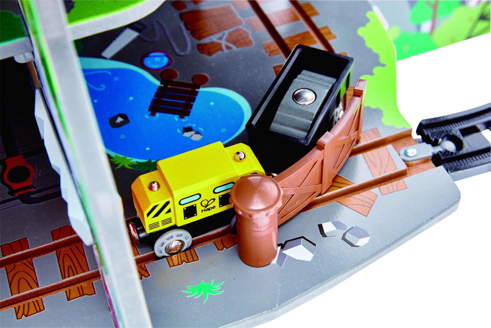 Spielen mit Tiefgang! Fahre deinen Zug von der Spitze des Berges in die betriebsame Mine tief im Inneren! Dieses mehrstöckige Spielset bietet das ultimative Holzschienen-Erlebnis Í mit Wasserfall-Tunnel, Hindernis-Brücke, Kran, Förderband und Werkstatt!