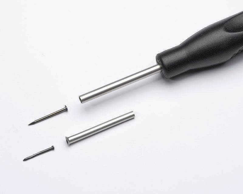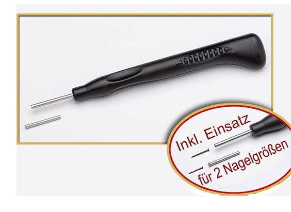 Dem Nagler ist geeignet für Nägel mit einem maximalen Kopfdurchmesser von ca. 2 mm. Es liegt eine einsteckbare Hülse bei mit dem kleinere Nägel mit max. 1 mm Kopfdurchmesser eingedrückt werden können.
