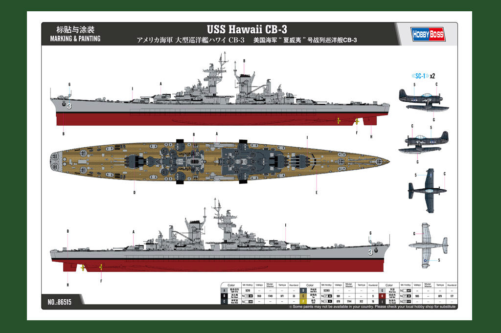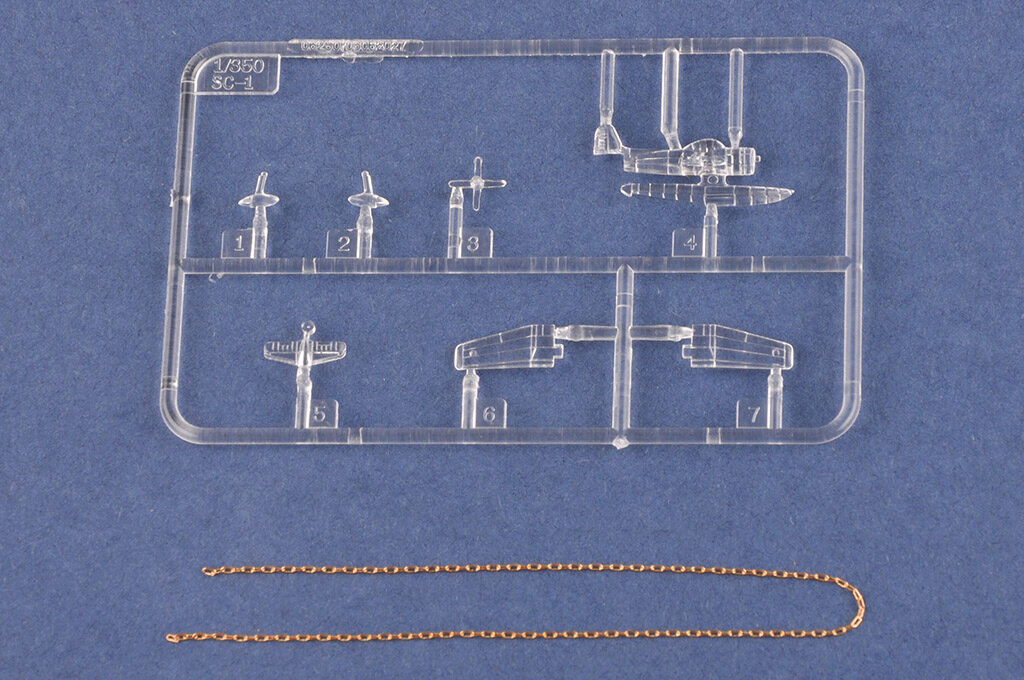 | More Features | hull made from multi-directional slide moulds. - Deck wood pattern finely rendered - Contains 2 SC-1 plane - Contains display stand and engraved name plate - Photo-etched frets included |