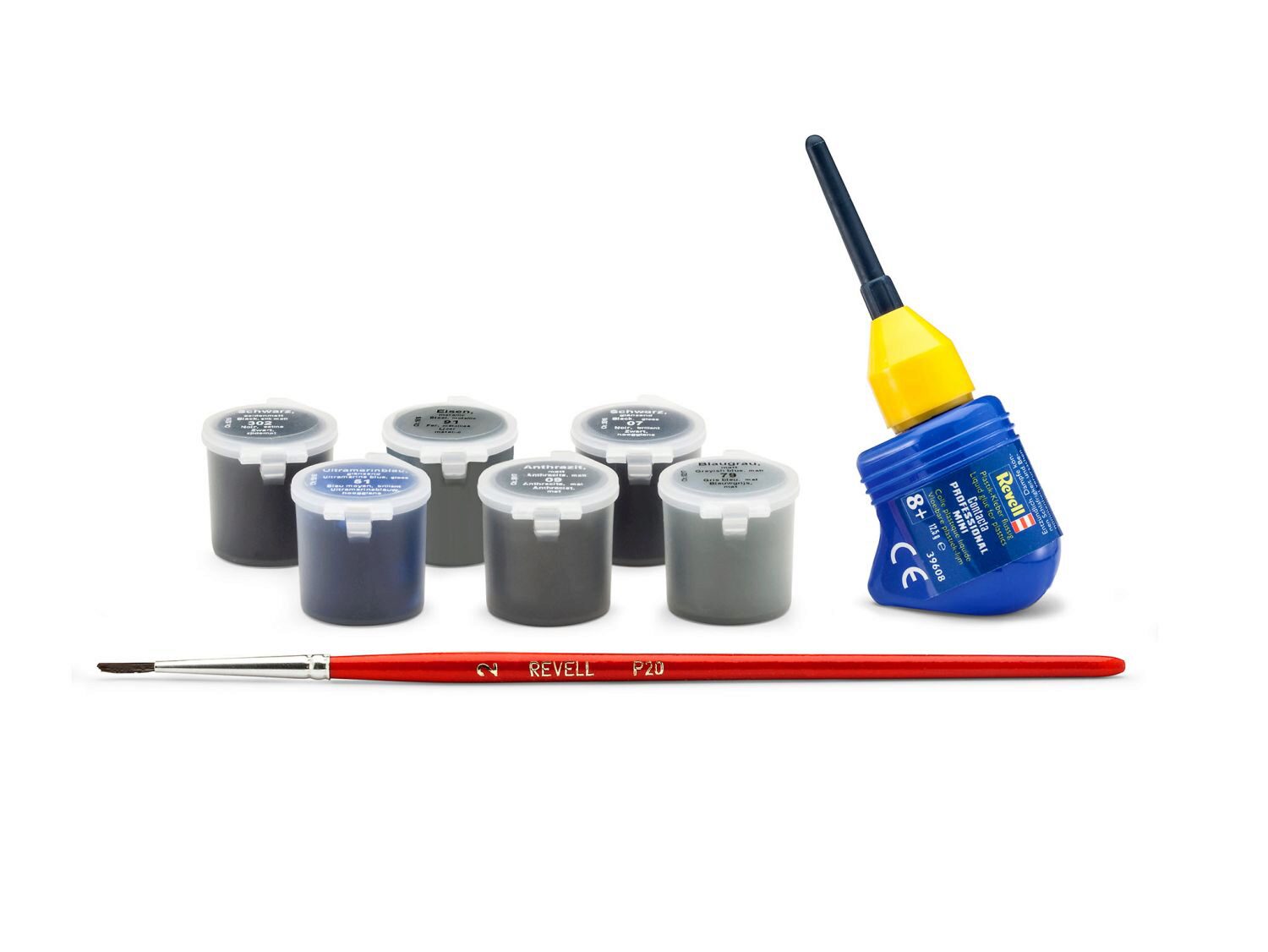 - Abziehbilder mit verschiedenen Kennzeichen (D, GB, F, NL, B, A, CH, I, S, DK) Neben Basisfarben sind auch Kleber und Pinsel enthalten.