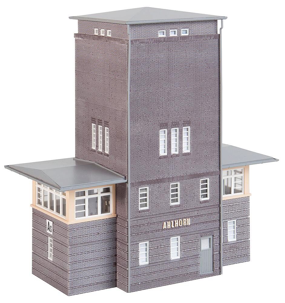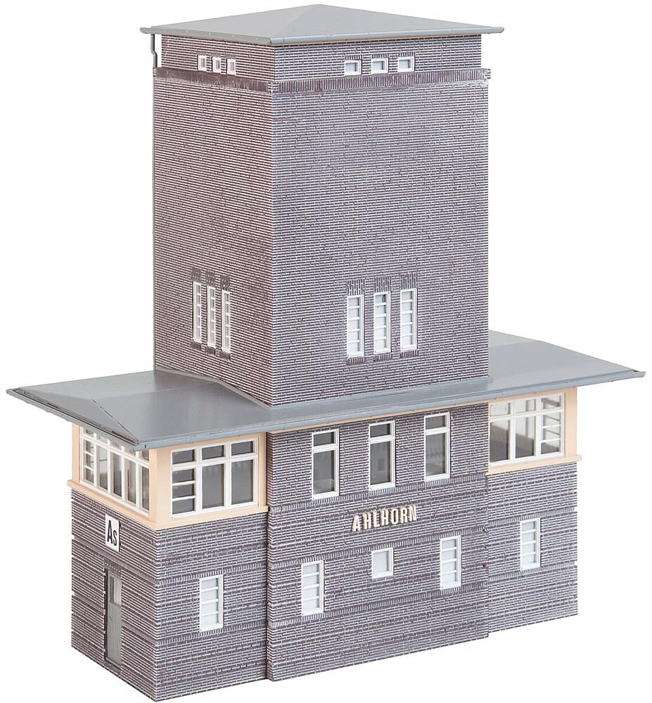 Rechteckiges, mechanisches Stellwerk mit mittig integriertem Wasserturm, viergeschossiges Gebäude im Baustil der neuen Sachlichkeit.