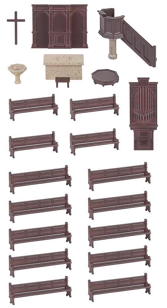 Set mit verschiedenen Einrichtungsstücken und Gegenständen für die Ausstattung des Kircheninnenraums, wie ein Altar und Kirchenbänke, Orgel, Beichtstuhl, Kanzel, Kreuz und Taufbecken.