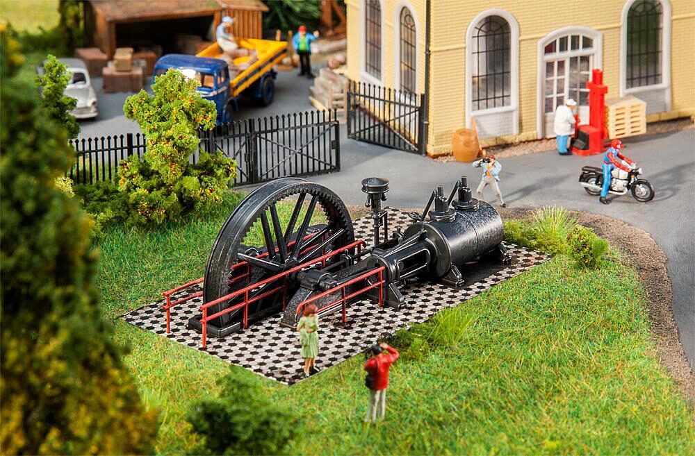 Liegende Einzylinder-Dampfmaschine mit digital bedruckter Bodenplatte in Kacheloptik für die Ausstattung von Maschinenhäusern und Industriemodellen.