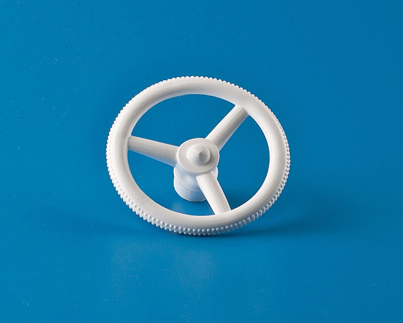 Griffiges Lenkrad mit 3 Speichen, mit Nabe und Bohrung für die Lenkachse. Aus weißem Kunststoff, problemlos zu bemalen.