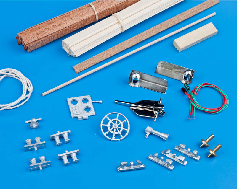 Im Beschlagsatz befinden sich alle äußeren Beschlagteile, wie funktionierende Positionslichter, Anker, Steuerrad, Poller usw.