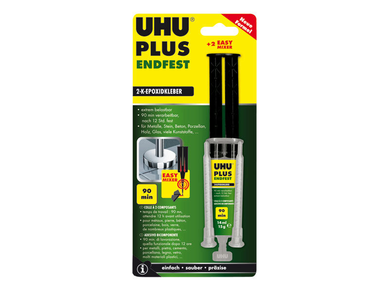 2-Komponenten-Epoxidharzkleber Lösungsmittelfreier Zweikomponenten-Klebstoff auf Epoxidharzbasis für höchste Belastungen. Die Verarbeitungszeit beträgt bis zu 120 Minuten. UHU plus endfest 90min ist sehr vielfältig einsetzbar, insbesondere wenn die Fügestelle extremen Belastungen standhalten muss. Das Mischungsverhältnis beträgt in den meisten Fällen 1:1 Binder und Härter (Volumen). Nach dem Mischen bleibt eine begrenzte Zeit - die Topfzeit - um die Klebstoffe zu verarbeiten. Neben einer hohen Endfestigkeit (bis zu 3000N/cm²) zeichnet sich die Klebeverbindung durch eine sehr hohe Schlagfestigkeit, Alterungs- und Feuchtigkeitsbeständigkeit aus.