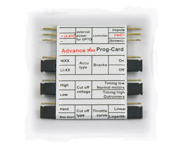 Mit der Programmierkarte kann der Fahrtregler einfach und schnell konfiguriert werden. Einfach Regler über die Servokabel an die Programmierkarte anschließen. Regler mit dem Akku verbinden und die Einstellungen über die steckbaren Jumper auswählen.