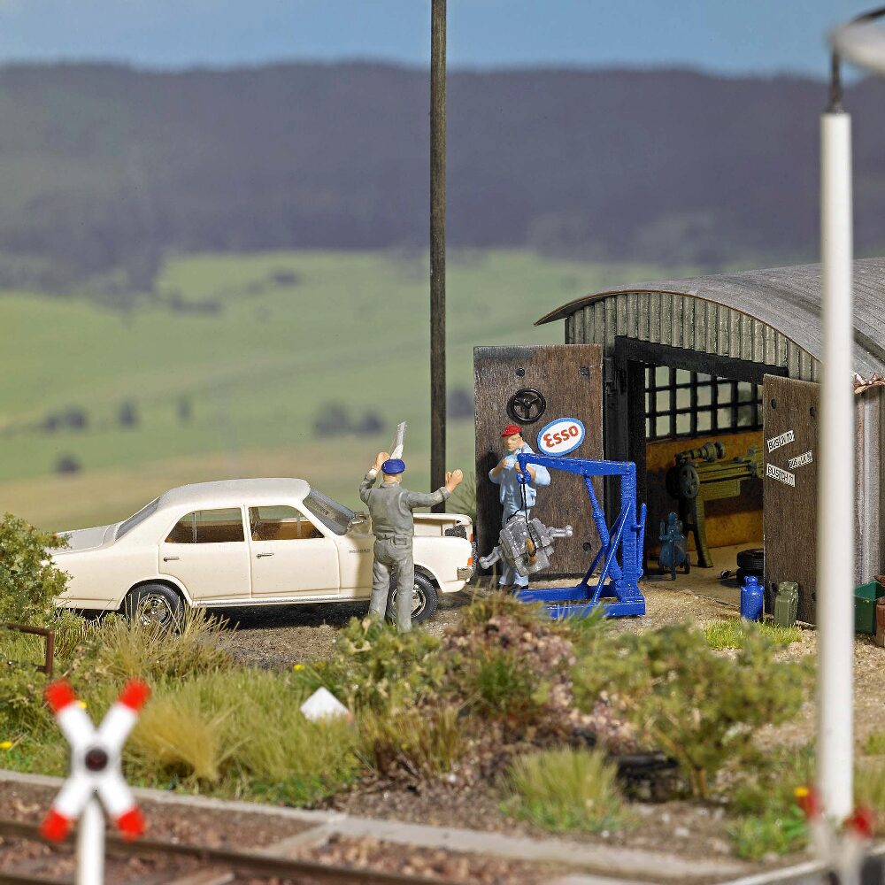 Für die Einrichtung einer KFZ-Werkstatt: Montagekran, Motorblock, Reifenmontage, Kompressor, Werkbank mit Schraubstock, Werkzeugwagen, Werkzeug, Ölkannen, Werkzeugkisten, Auffahrbleche, Kanister, Wagenheber, jeweils 12 Reifen und Felgen, Autositze, Lenksäulen und Stoßstangen. Bausatz. Geeignete Gebäude z.B. Gewerbehalle 1548 oder Schuppen 1593 bzw. 1595.